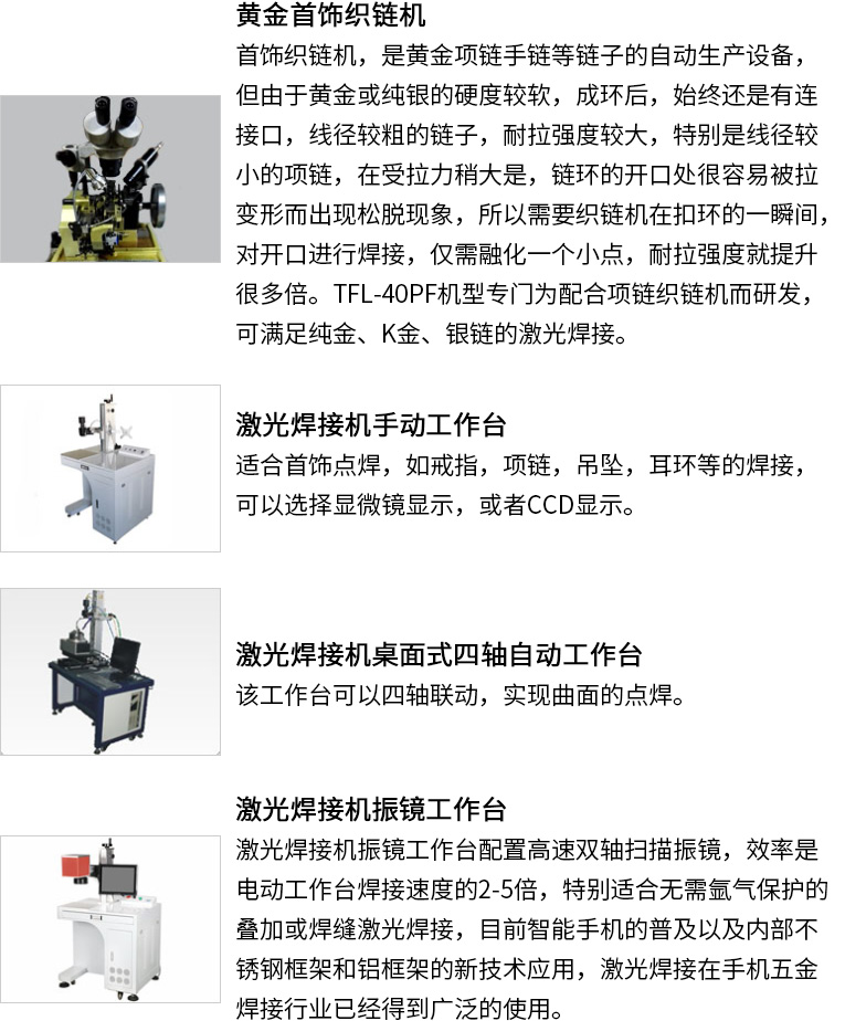 通發(fā)激光研發(fā)針配合黃金織鏈機、K金制鏈機、首飾制鏈機的TFL-80PF自動激光焊接機,焊接機采用能量反饋技術(shù),光點穩(wěn)定,能量強勁,實現(xiàn)一環(huán)一焊的功能,確保金鏈的耐拉強度。本激光焊機實現(xiàn)了水冷一體的小型化結(jié)構(gòu)。適用于各種生產(chǎn)場所。